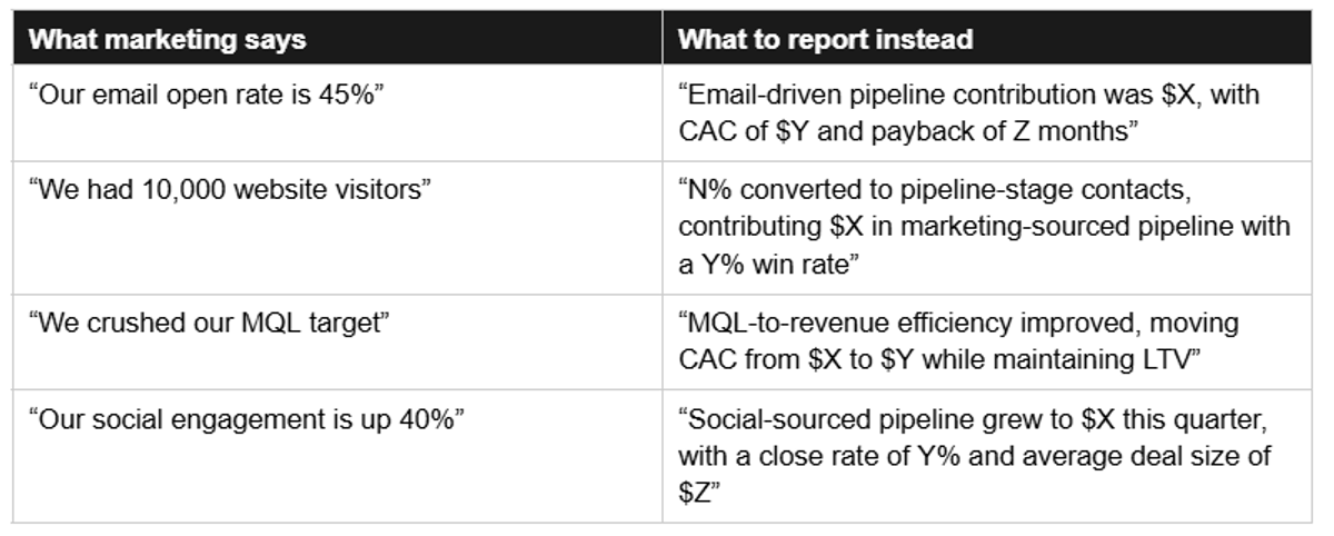 When your board sees a slide that leads with “45% email open rate” or “500 MQLs this month, up 30%,” they hear one thing: this team can’t connect their work to the P&L.