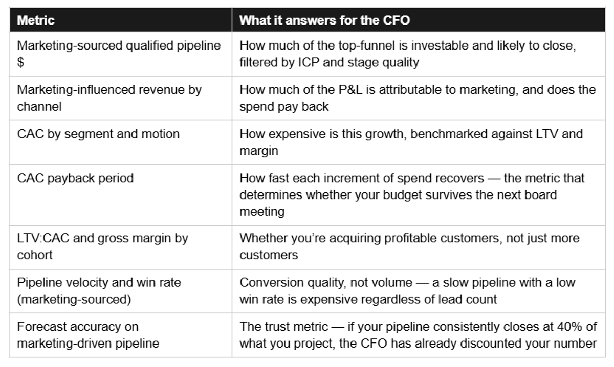 The fix is a translation layer: a lean scorecard above your campaign metrics that converts marketing activity into the language of capital allocation. Something your CFO can read without asking you to define MQL for the fourth time.